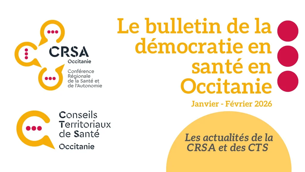 Bulletin Démocratie en Santé en Occitanie - Février 2026 Les actualités des CRSA et des CTS en janvier - février 2026 Au sommaire : Les actus de la CRSA & des Conseils Territoriaux de Santé : Réforme des instances de démocratie en santé : communiqué inter-CRSA et position des CTS 31 et 66 Représentation de la CRSA à la Conférence Nationale de Santé Actus du CTS des Hautes-Pyrénées Les actus des Commissions Spécialisées de la CRSA : Outil de la Commission 'Droits des Usagers' pour améliorer l'accès aux soins des personnes en situation de handicap Soutien de la Commission 'Médico-Social' à l'accompagnement des aidants Travaux de la Commission 'Prévention' sur la promotion vaccinale Actualités de la Commission 'Organisation des Soins' Remerciements à Didier Jaffre Bonne lecture ! Bulletin de la démocratie en santé - février 2026.pdf Partager 10 mars 2026