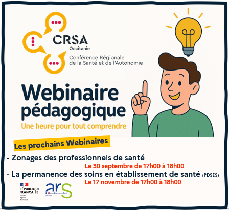 Webinaire d'information - PDSES Date de l'évènement : 17/11/2025 schedule 17:00 schedule 18:00 En visio-conférence En prévision de l'assemblée plénière du 9 décembre, la CRSA et l'ARS Occitanie proposent un webinaire pédagogique d'une heure pour mieux comprendre le schéma de permanence des soins en établissements de santé (PDSES). Pour obtenir le lien de connexion, contactez : missions@crsa-occitanie.fr Partager lundi 17 novembre 2025